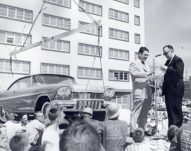 It was Saturday, June 15th, 1957. As part of the semi-centennial celebrations taking place in Tulsa, Oklahoma, named Tulsarama!, citizens gathered around the southeast corner of the County Courthouse lawn to see the burial of a brand new gold and white 1957 Plymouth Belvedere.