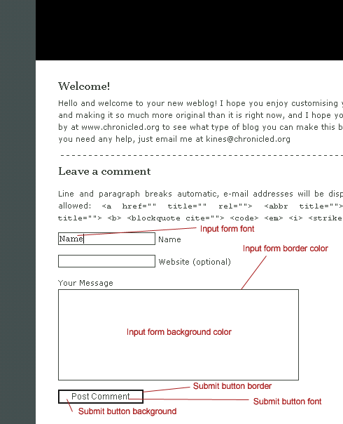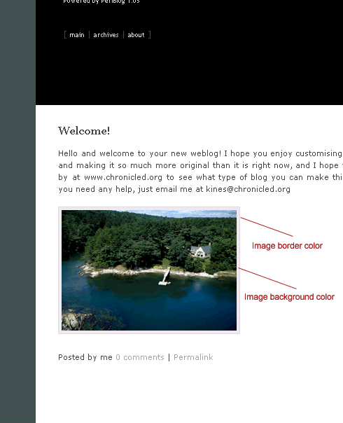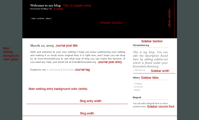 These images attempt to give you an idea about the extent to which customising PerlBlog is possible without ever using Perl or CSS. All you need to do is to change weblog-config.pl attributes, all of which are thoroughly and concisely commented. With over 100 attributes to tailor, you're sure to get exactly what you want. The attributes are shown in red. Many have sub-attributes, such as font-size, font-family, weight, color, decoration, or even background image.